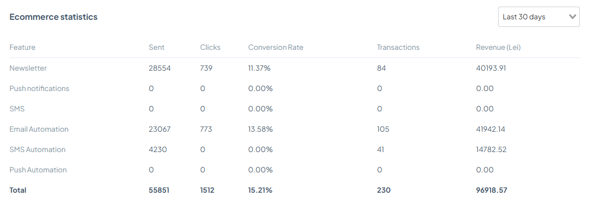 • analiză completă a performanței: open rate, CTR, conversii, revenue generated