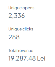 analiză completă a performanței: open rate, CTR, conversii, revenue generated